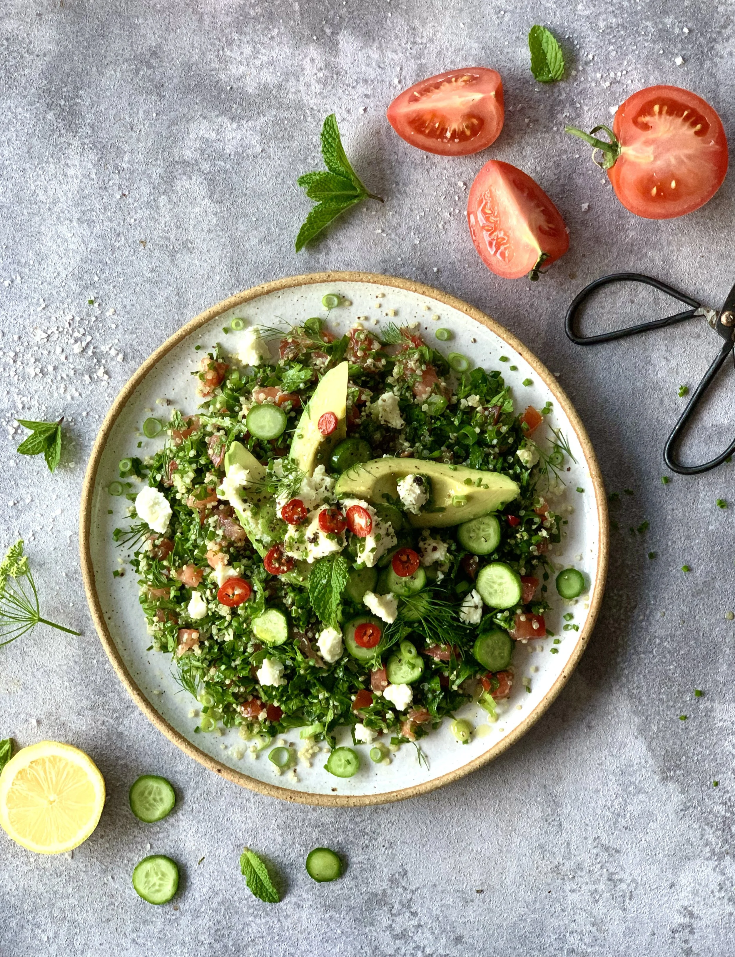 Cucumber is also a big no no but I actually really love the texture it brings to the salad. Traditionally the salad is made from parsley, tomato bulgar wheat, lemon juice, olive oil, spring onion and maybe mint. I always use quinoa as I like the taste better plus its gluten free and so often I'm cooking for people who cant eat gluten. Garlic, cucumber, quinoa, avocado, goat's cheese......It's pretty obvious I've gone completely of track from the original version. So apologies to any traditionalists out there! I'm trying to be very clear this is not a traditional version! That being said, I think it still has the essence of the real thing; light, fresh and zesty.