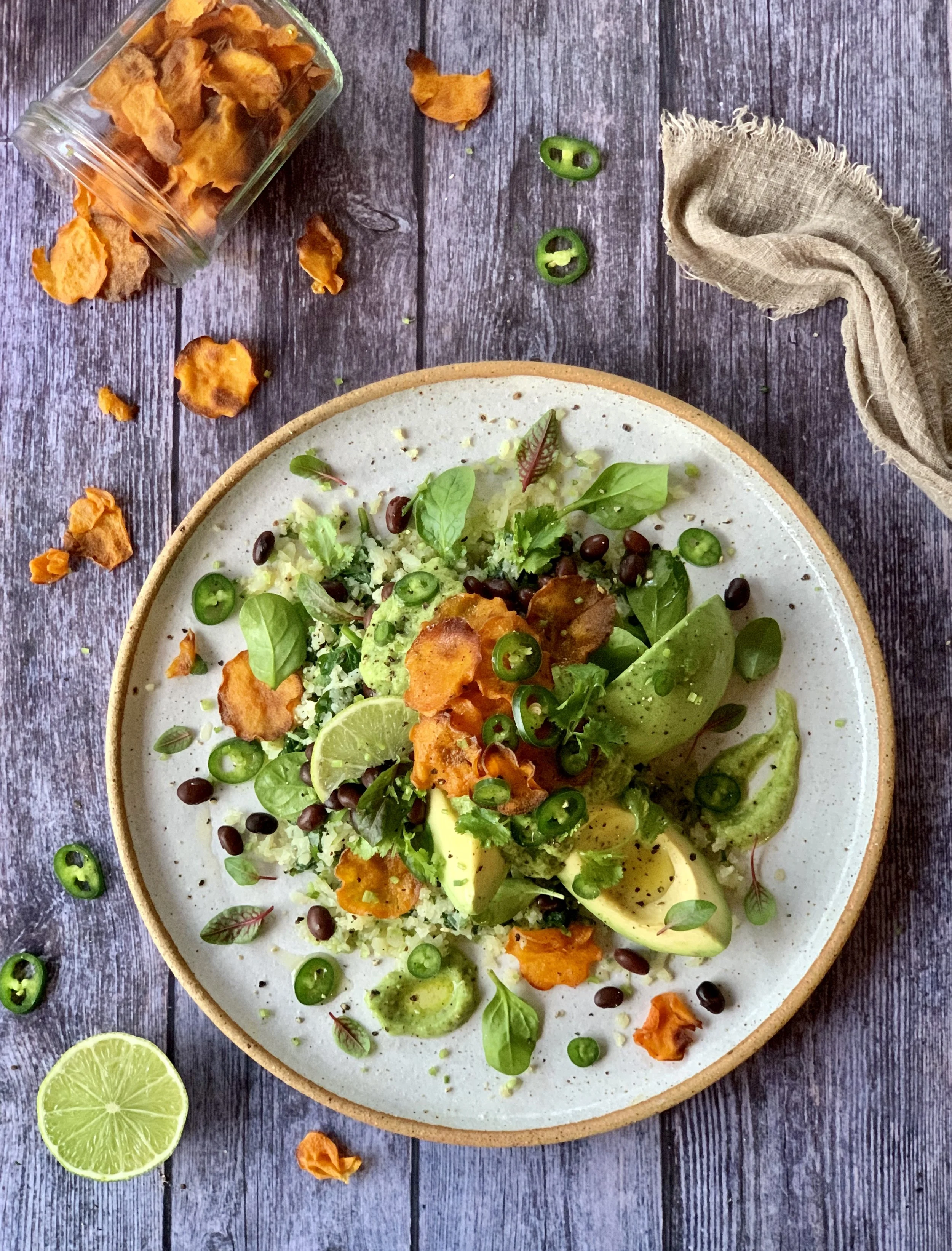 Super Simple Burrito Salad with Black Beans, Sweet Potato and Avocado Mayo